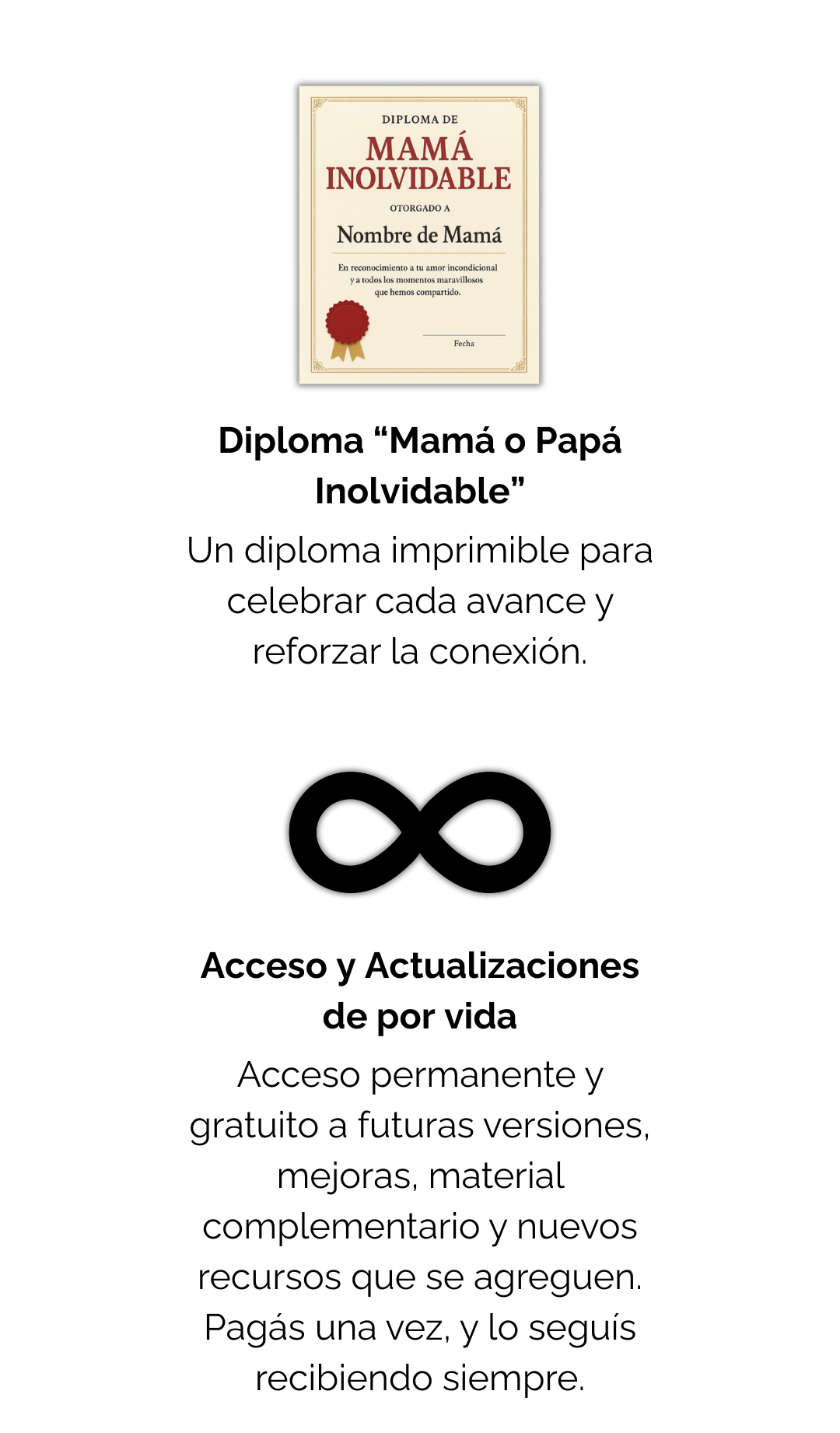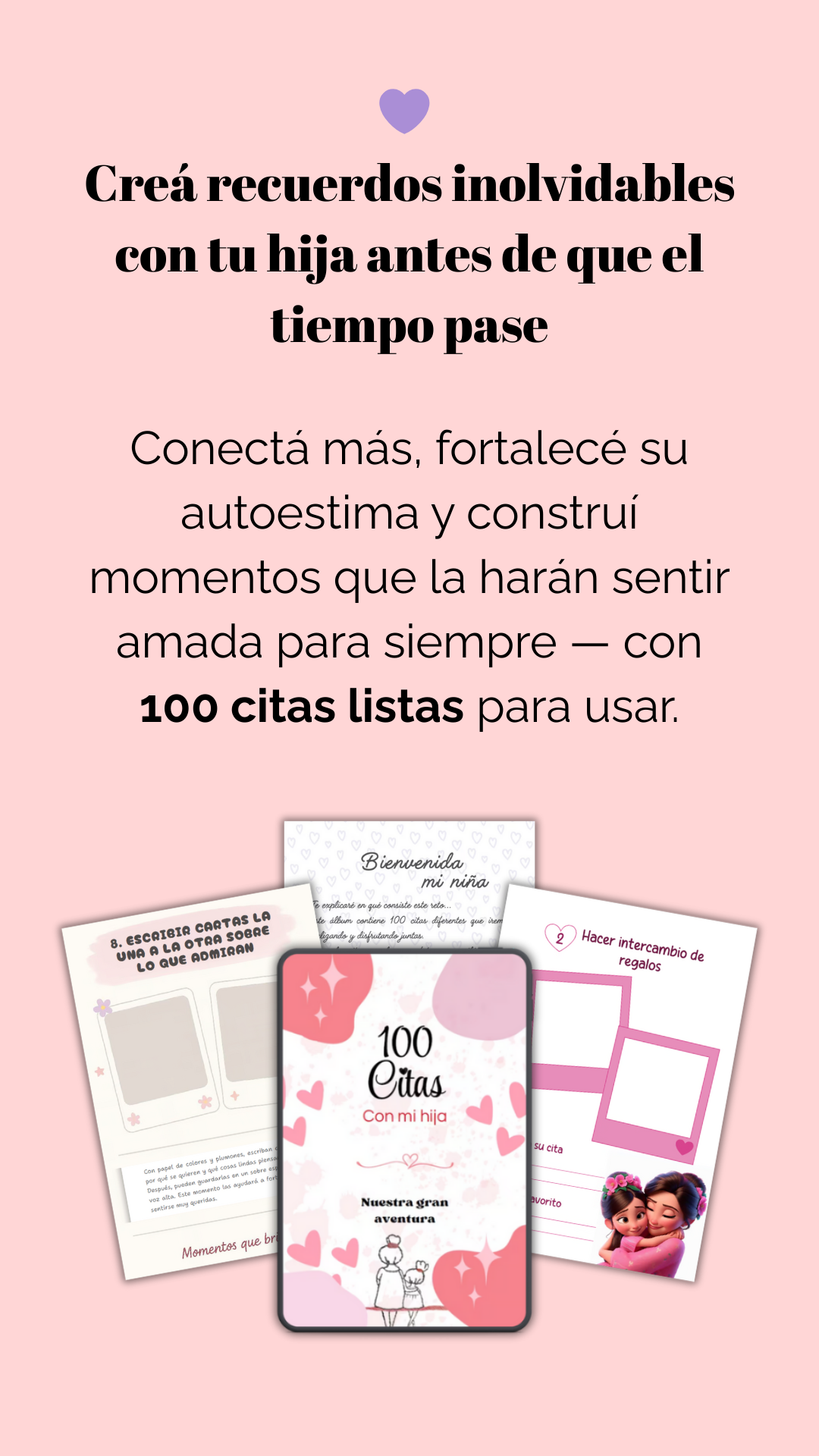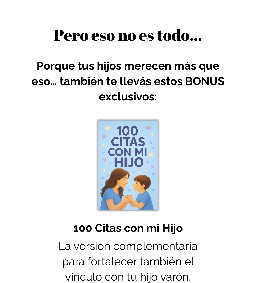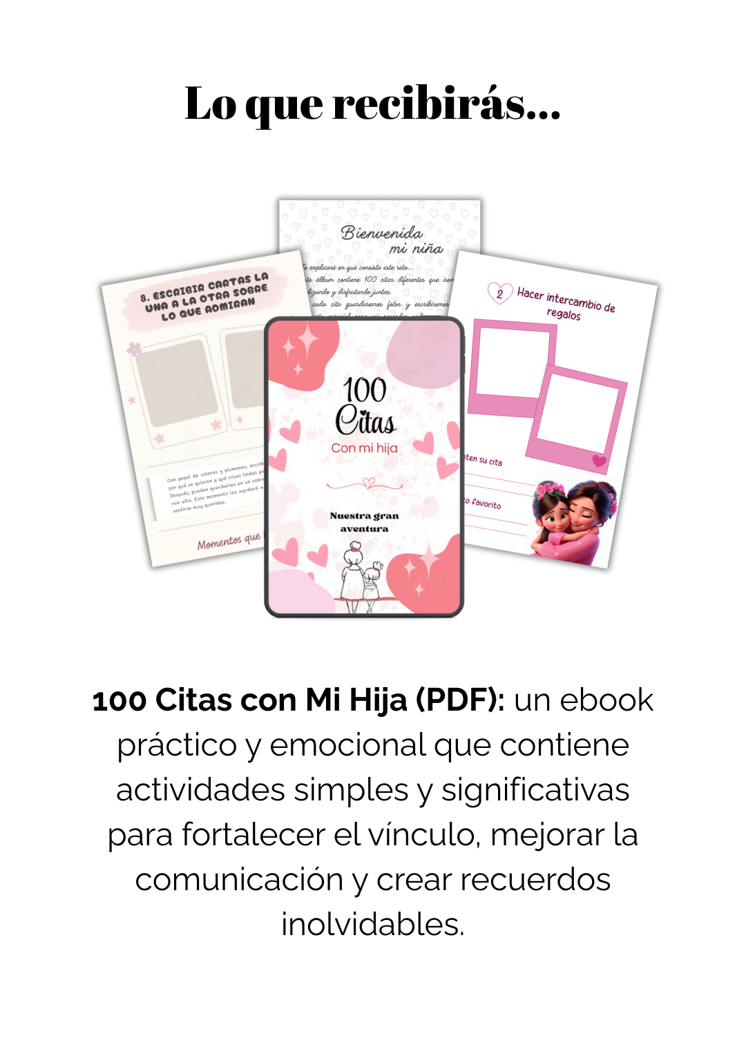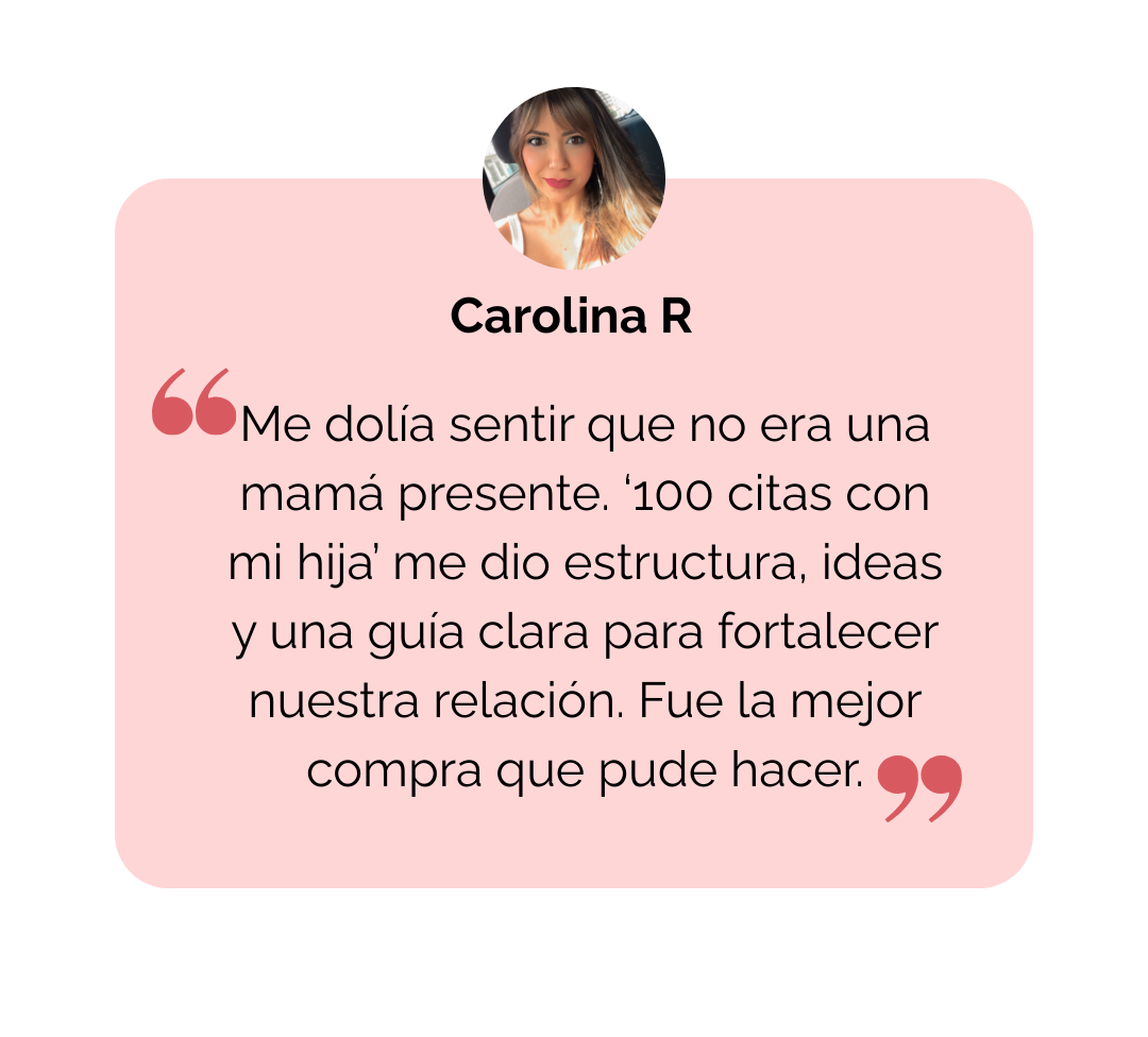 👨👩👧👦 Recibes varias versiones del libro “100 Citas con mi Hijo / Hija”, más bonos especiales como el calendario de seguimiento, diploma mama y más sorpresas.